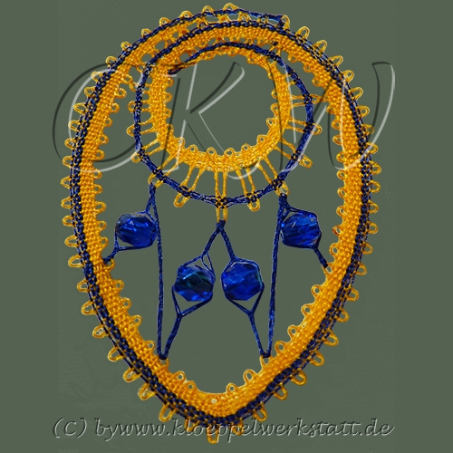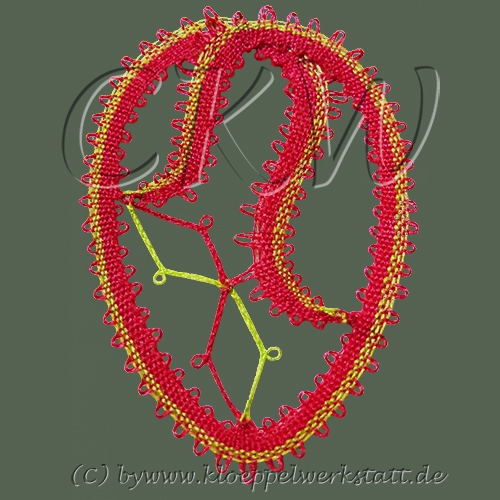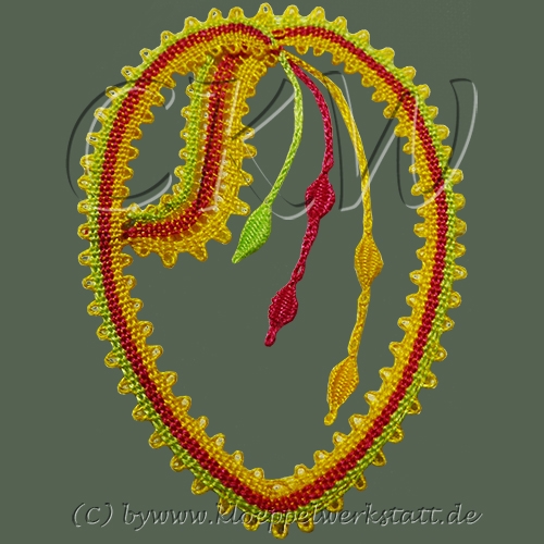 Slincas kommen aus der Idrija Technik, das schmale Band wird im Leinenschlag als enger Riß und das breite Band im Halbschlag, mit Innen -oder Außennadel, geklöppelt.