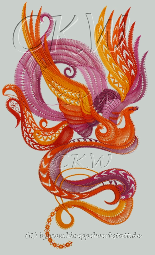 Die Veröffentlichung des Musters ist für Anfang Oktober 2019 geplant - der Feuervogel ist mit Franks Baumwolle NeB 30/3 und NeB 40/2 gearbeitet worden.